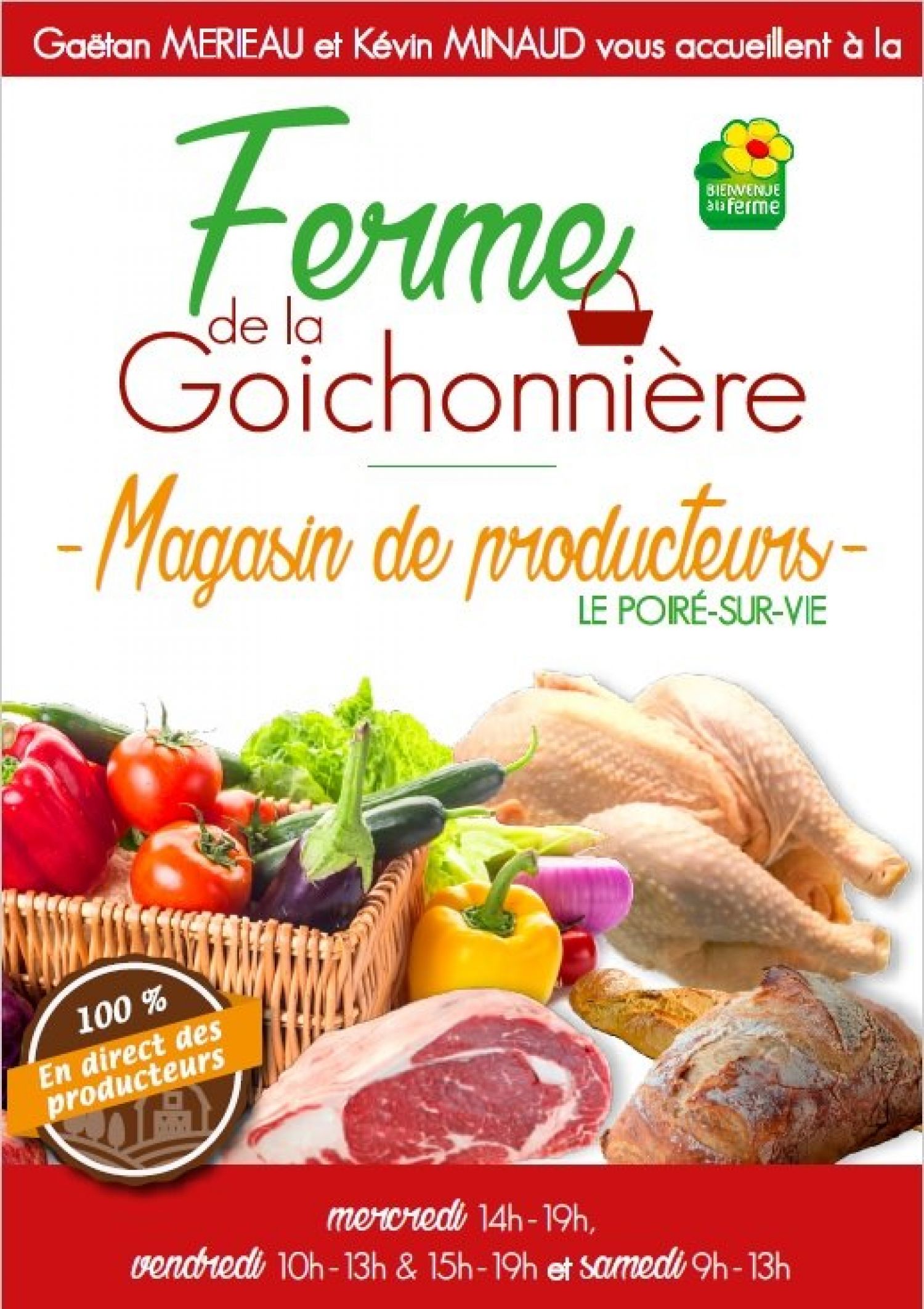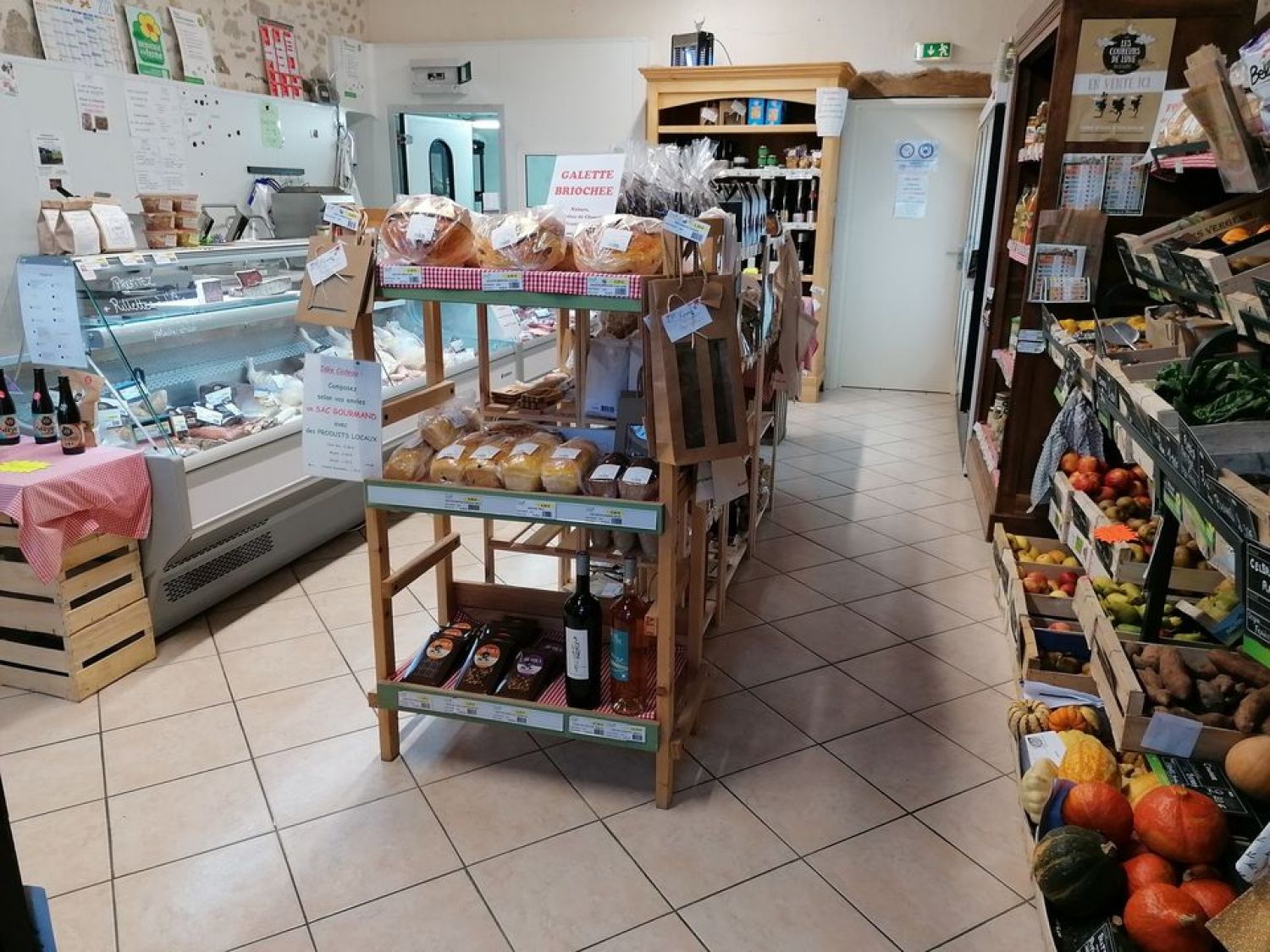 Vous y trouverez les produits de la ferme: rayon boucherie (volailles , vache, veau), mogette, pain, préfou et pâtisseries (fouace, brioche, pain d'épices, fion) ; et ceux de nombreux autres producteurs locaux: charcuterie artisanale, fruits et légumes, fromages et laitages de chèvre et de vache, épicerie sucrée (miel, confiture, granola, biscuits) et salée (chips, pates, conserves de poissons, de canard, de légumes), huiles, vinaigres, farine, jus de pommes, de raisins, cidre, bières, vins, glaces, chocolat, savons, dentifrice...