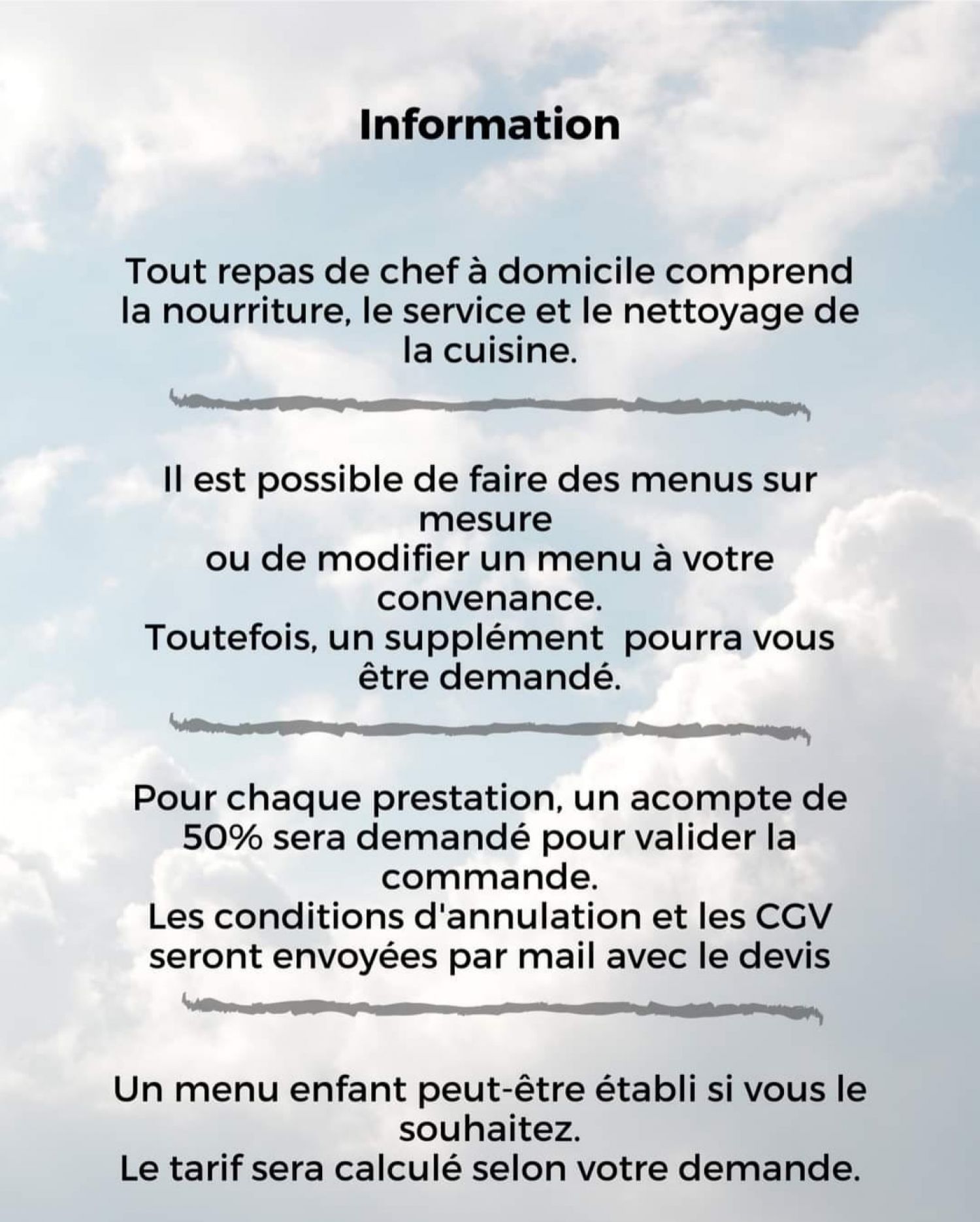 Un chef privé s’occupe de tout : achat des ingrédients, préparation du repas sur place, service à l’assiette puis rangement de la cuisine avant de s’éclipser.